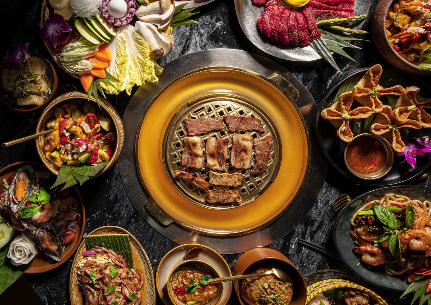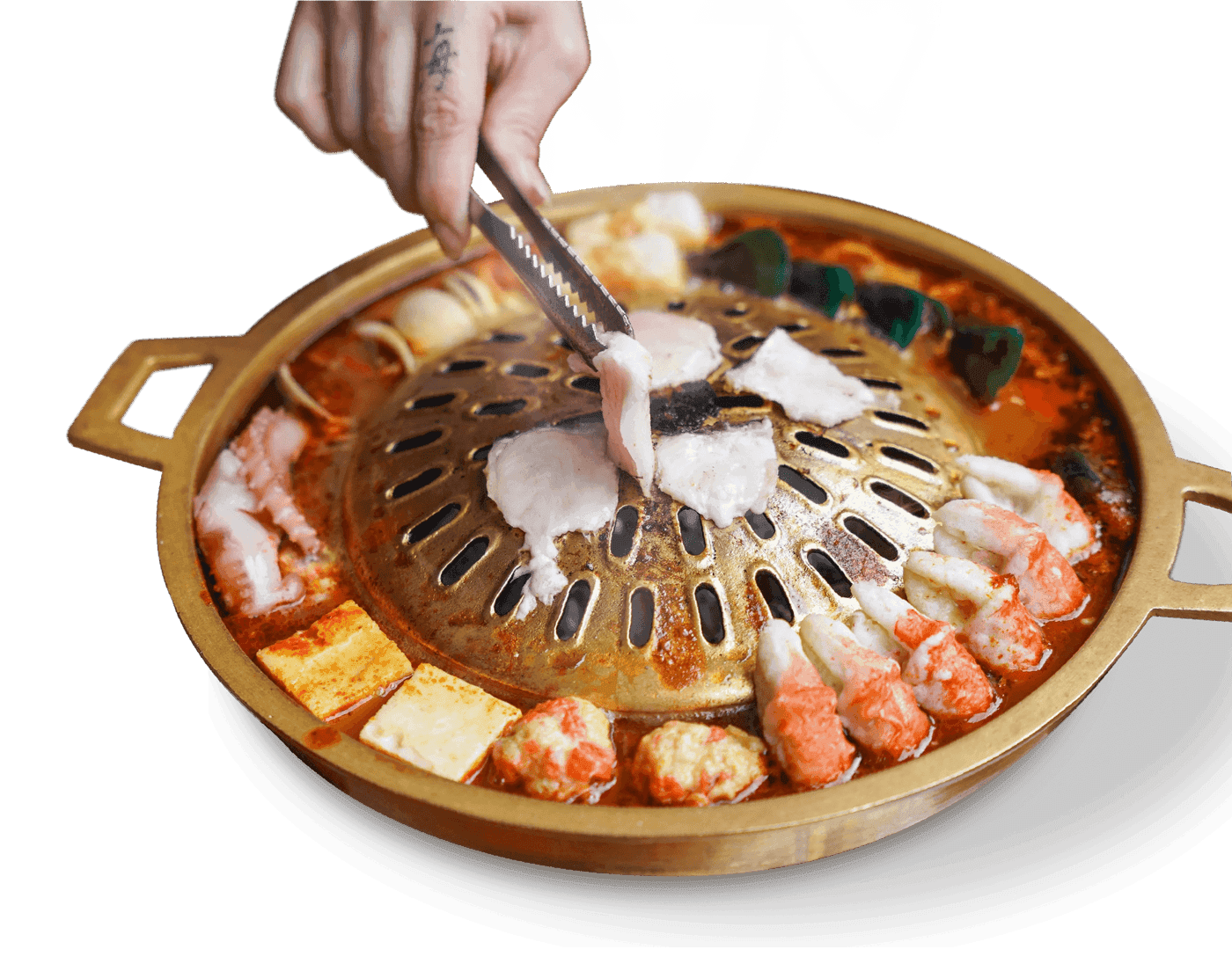 At the center of the mookata, the BBQ grill sears marinated meats, seafood and veggies to smoky perfection. Its domed shape allows excess fat to drain, ensuring a crisp finish while enriching the surrounding broth. This dynamic centerpiece blends grilling with the communal joy of hot pot dining.